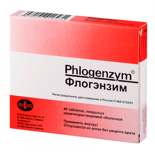 Флогэнзим представляет собой комбинацию ферментов (бромелаин и трипсин) и рутина. Бромелаин и трипсин способствуют быстрому расщеплению клеточных фрагментов и метаболических продуктов воспалительного процесса, рутин восстанавливает проницаемость стенок сосудов, что приводит к уменьшению отеков и гематом.